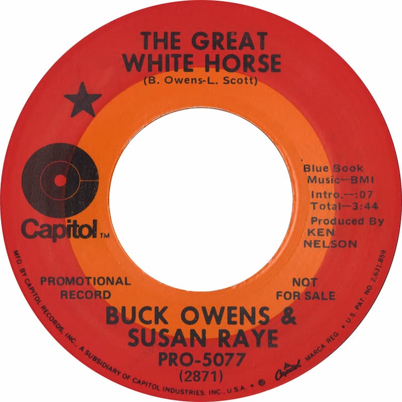 The track was cut in Bakersfield, California, at Buck Owens’ own studio, using his road band rather than the large studio orchestras popular in Nashville at the time. Sessions from this era were typically overseen by longtime producer Ken Nelson alongside Owens himself, maintaining the lean, guitar-driven sound that had carried Buck through his 1960s Capitol hits. Susan Raye was by then an established member of the Buck Owens organization: she co-hosted segments on his syndicated TV show and recorded a string of solo singles, so giving her equal billing on a song like “The Great White Horse” was a natural extension of their working partnership.