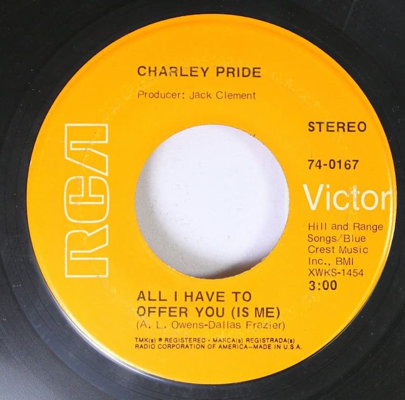 Additionally, on Charley’s early releases, RCA credited four well-known and highly-regarded producers on each disc: Chet Atkins, Bob Ferguson, Felton Jarvis and Jack Clement, even though Clement is the only one of these four men who ever actually entered any studio with Charley Pride. The label felt it was essential for the disc jockeys to see those names on there, proving that this was a bona fide artist and not just some “gimmick” once Charley’s skin color was revealed. For extra emphasis, each of Pride’s first five singles credited the artist as “Country” Charley Pride. The third record, “Just Between You And Me” was the first to chart, reaching #9 in 1966. Each successive release after that slightly improved his chart standing, and seven records later, “All I Have To Offer You (Is Me)” brought him to the top.
