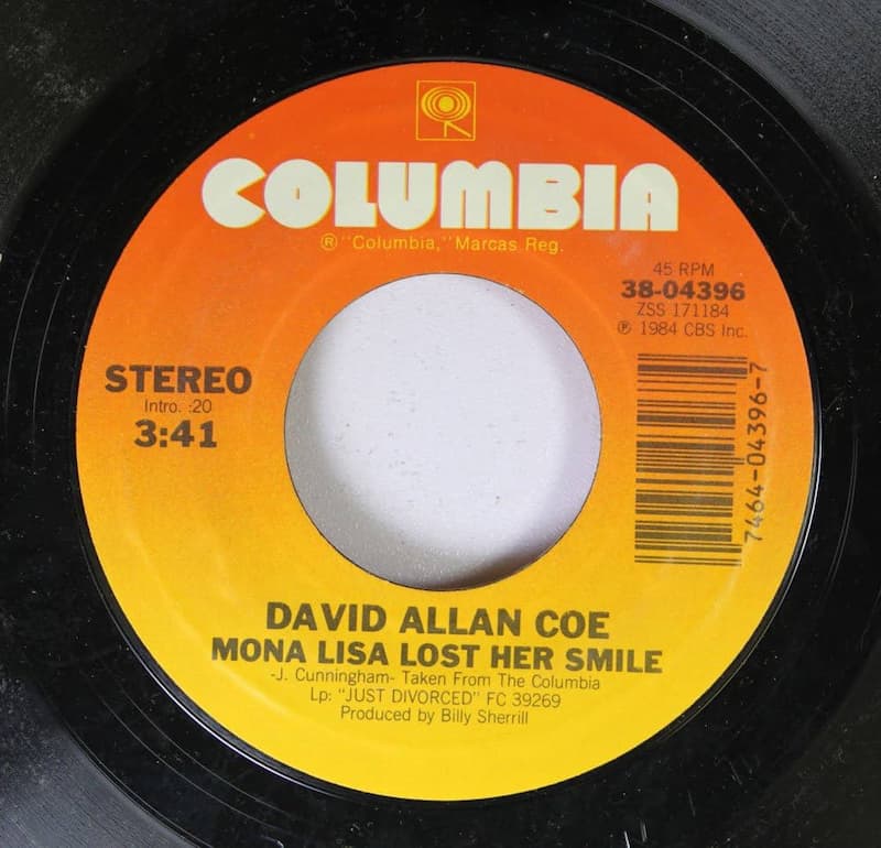 “Mona Lisa Lost Her Smile” is a song written by Johnny Cunningham and recorded by David Allan Coe. It was the first single from Coe’s 1984 album Just Divorced, and was released to radio in early 1984. The song is Coe’s highest-charting single, with a peak of number two on the U.S. country music charts.
