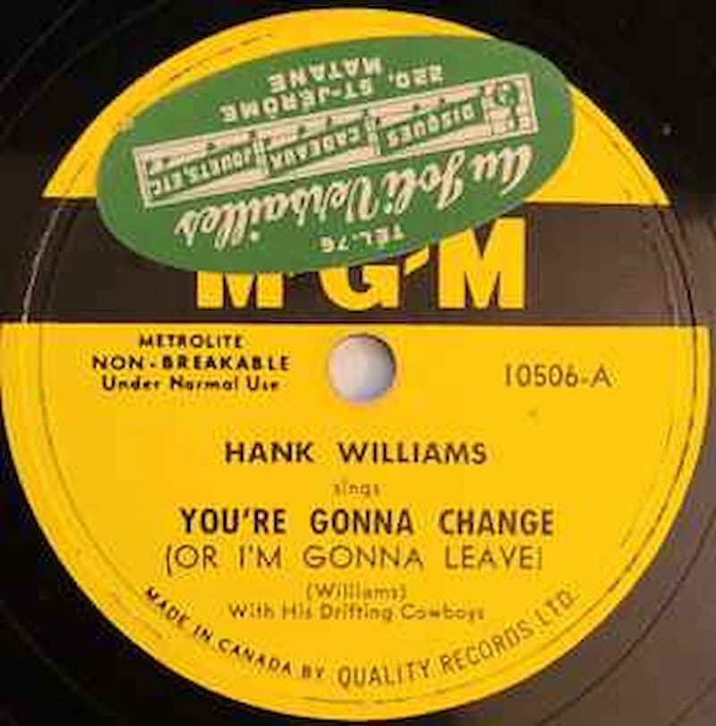 “You’re Gonna Change (Or I’m Gonna Leave)” is a country and western song written by Hank Williams and recorded with His Drifting Cowboys for MGM Records. Williams cut the track at Castle Studio in Nashville, Tennessee, on March 2, 1949, with producer Fred Rose overseeing the session. It was published by Acuff-Rose on August 5, 1949 and released as single MGM K10506 in September 1949, with “Lost Highway” on the B-side. On Billboard’s Best Selling Retail Folk (country) chart, the record climbed to No. 4, making it one of Williams’s early Top 10 hits as his national profile was rapidly growing.